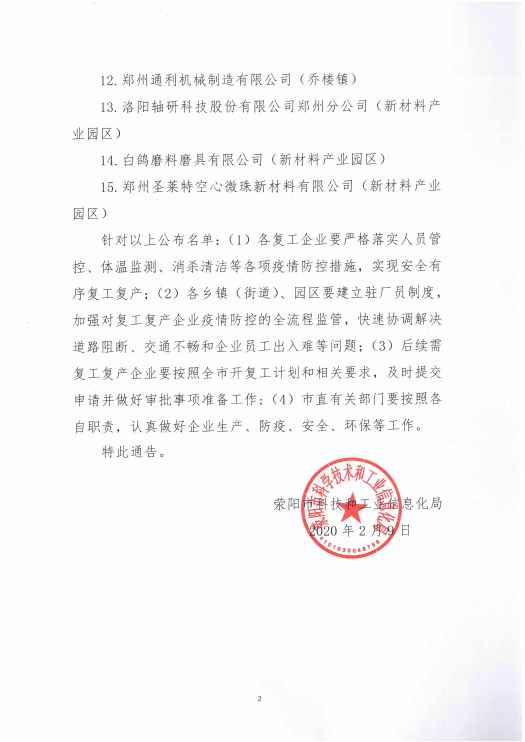 2020年2月9日,綜機(jī)公司經(jīng)滎陽(yáng)市科學(xué)技術(shù)和工業(yè)信息化局審批,于2月10日正式復(fù)工。